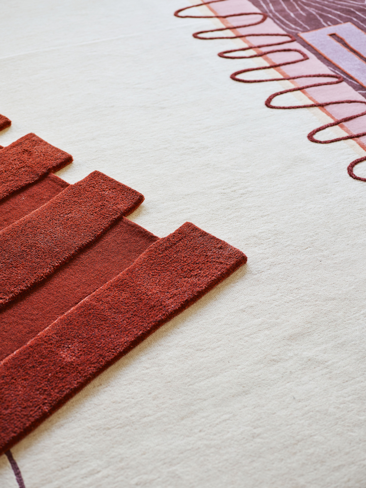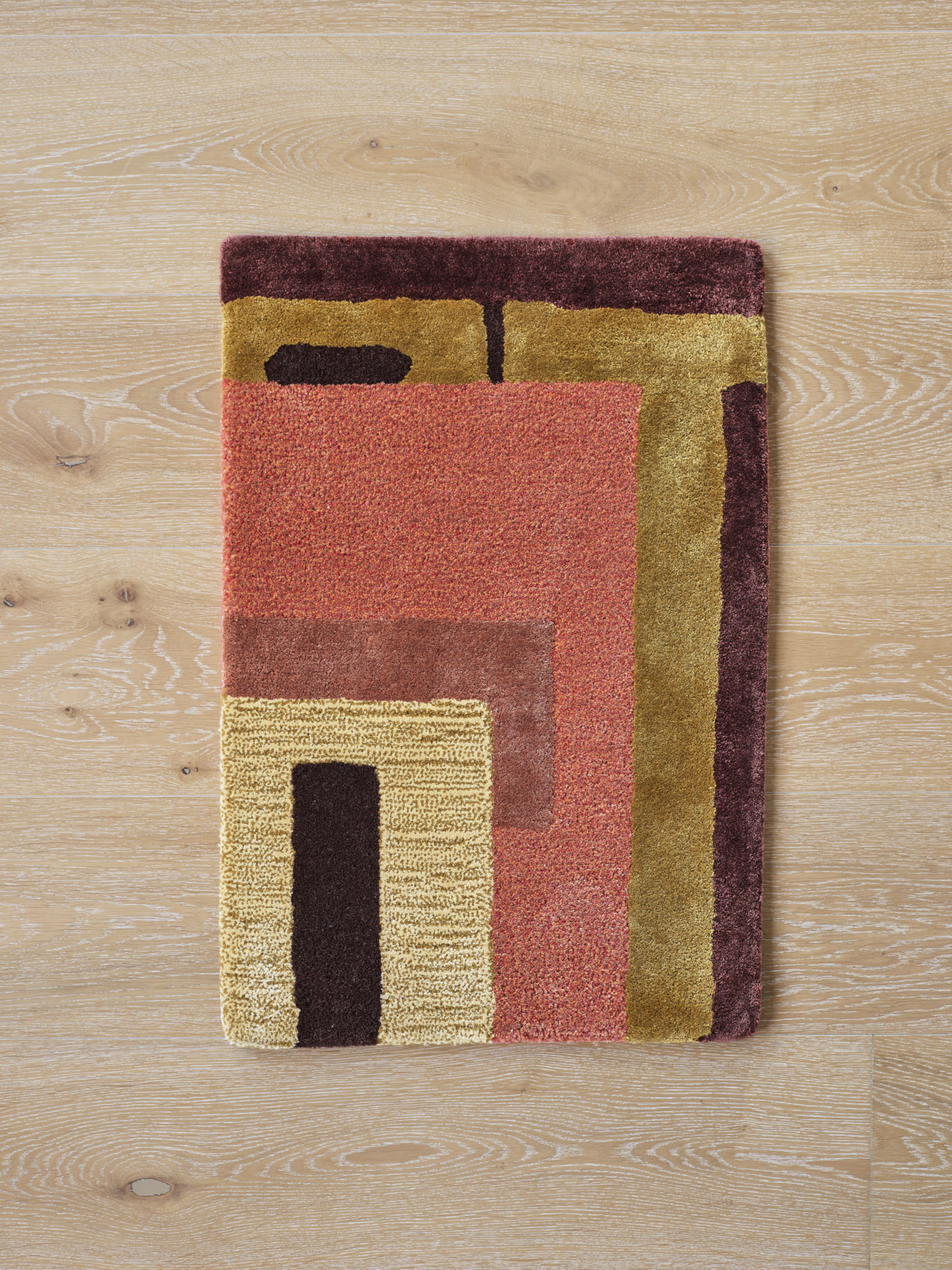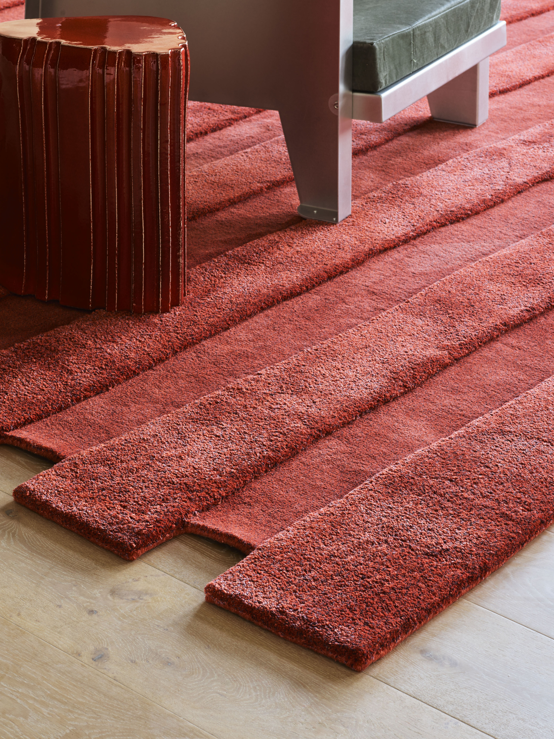 Hand-tufted in New Zealand wool and artsilk in a mix of both felted loop and cut pile