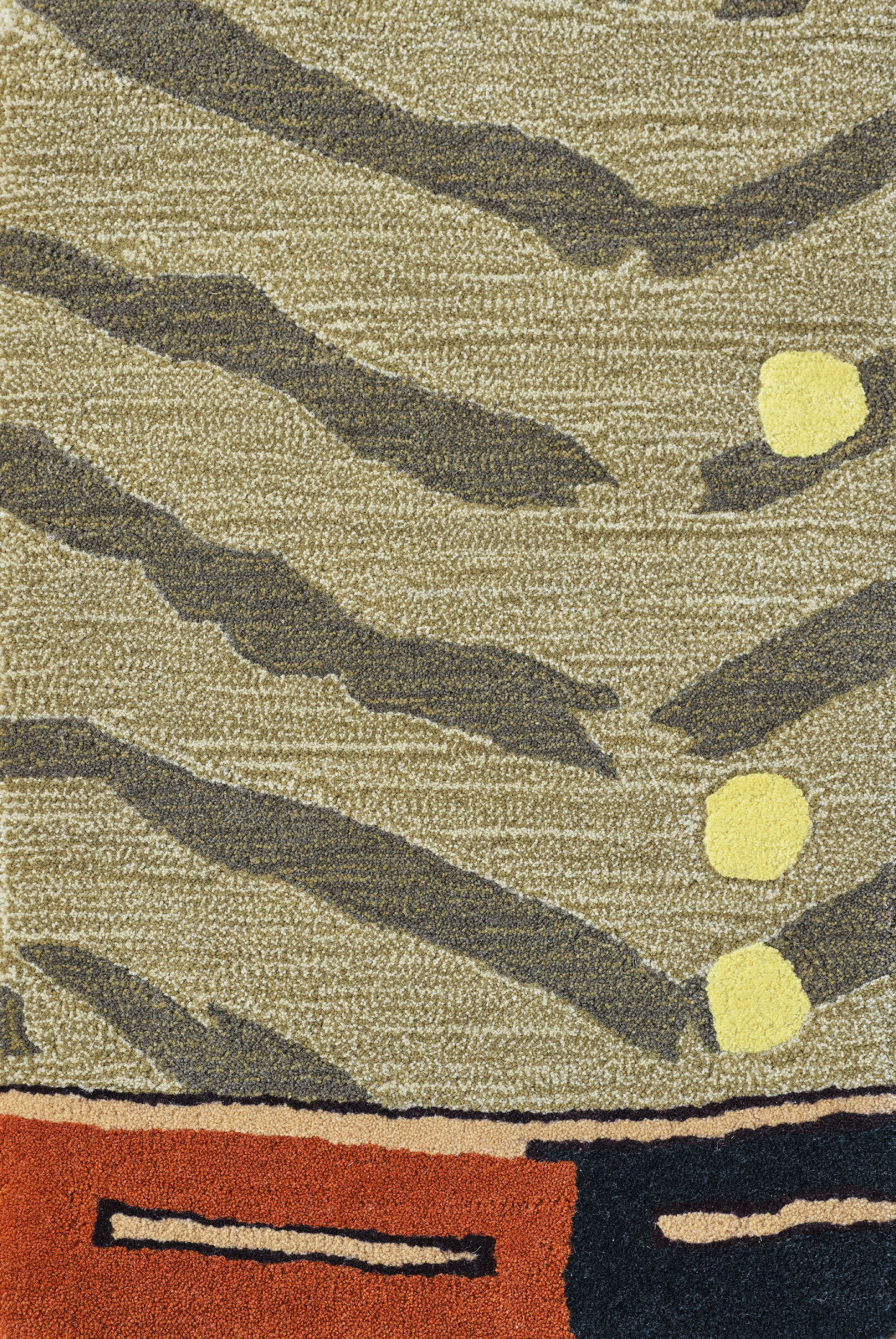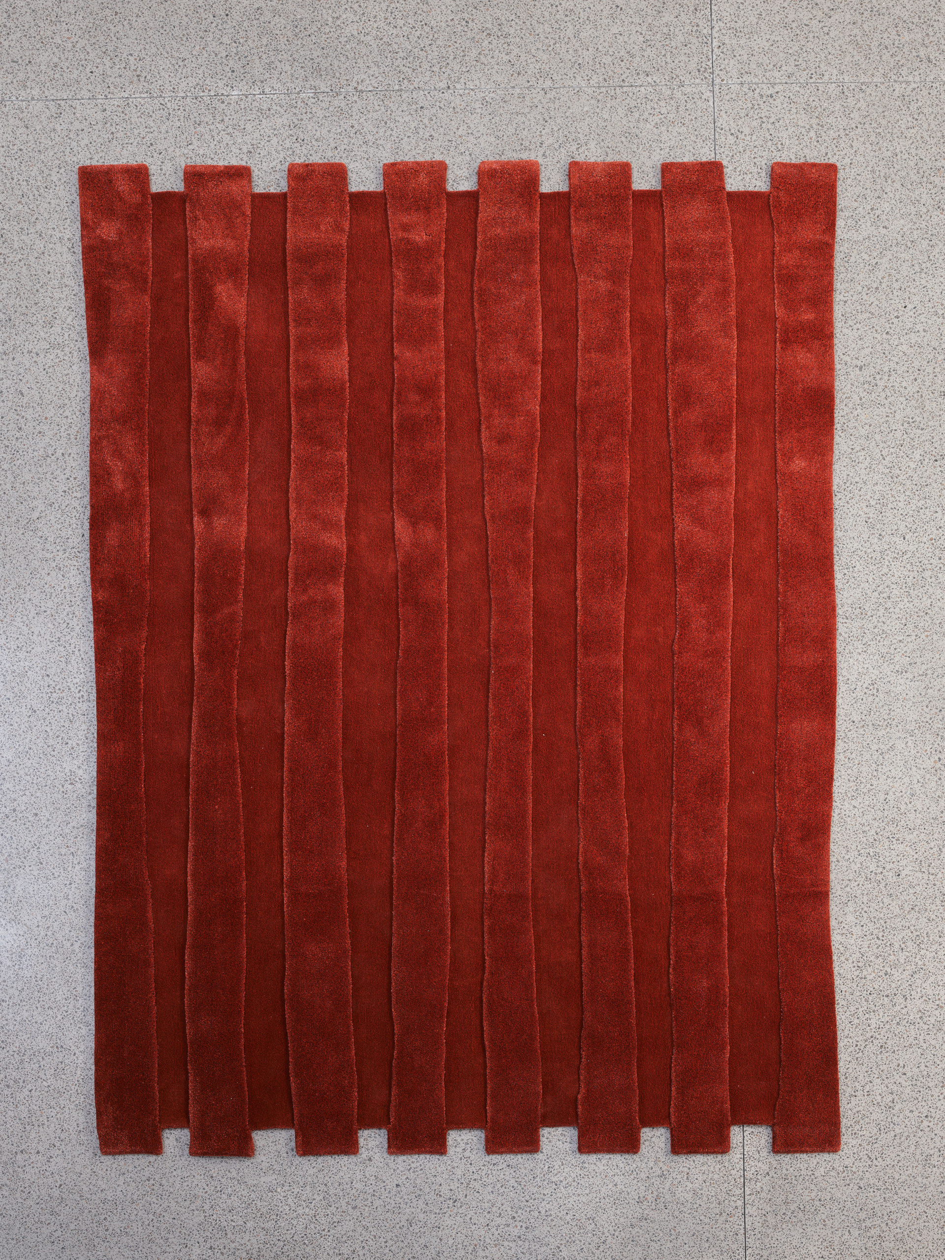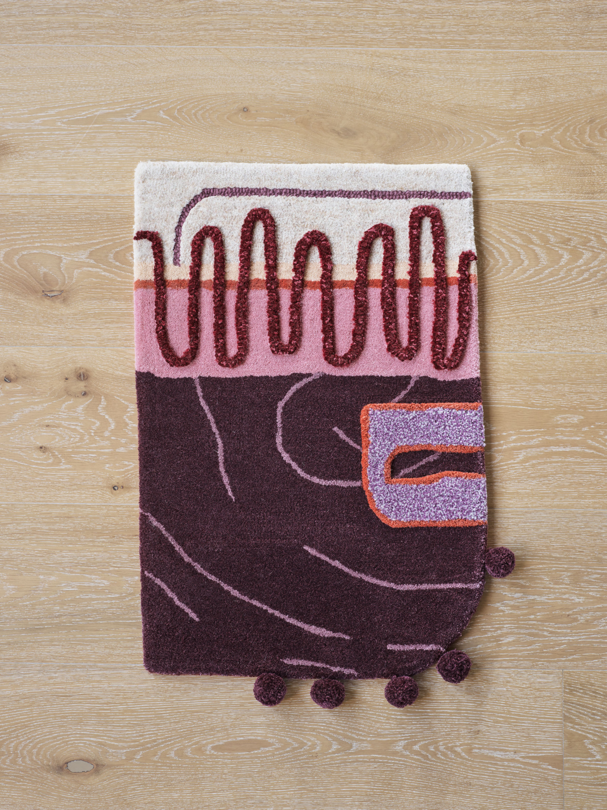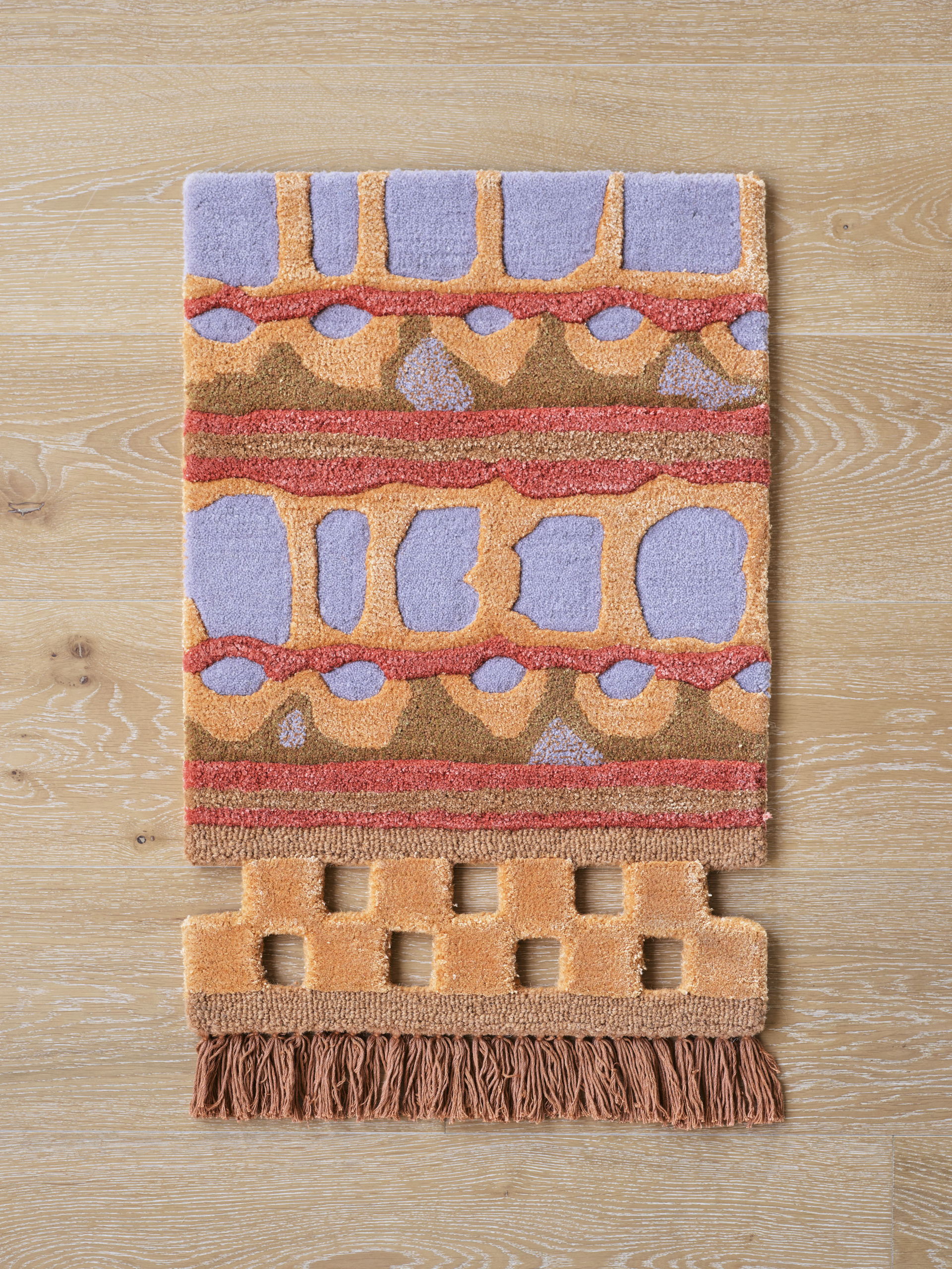 Hand-tufted in New Zealand wool and artsilk in a mix of both felted loop and cut pile