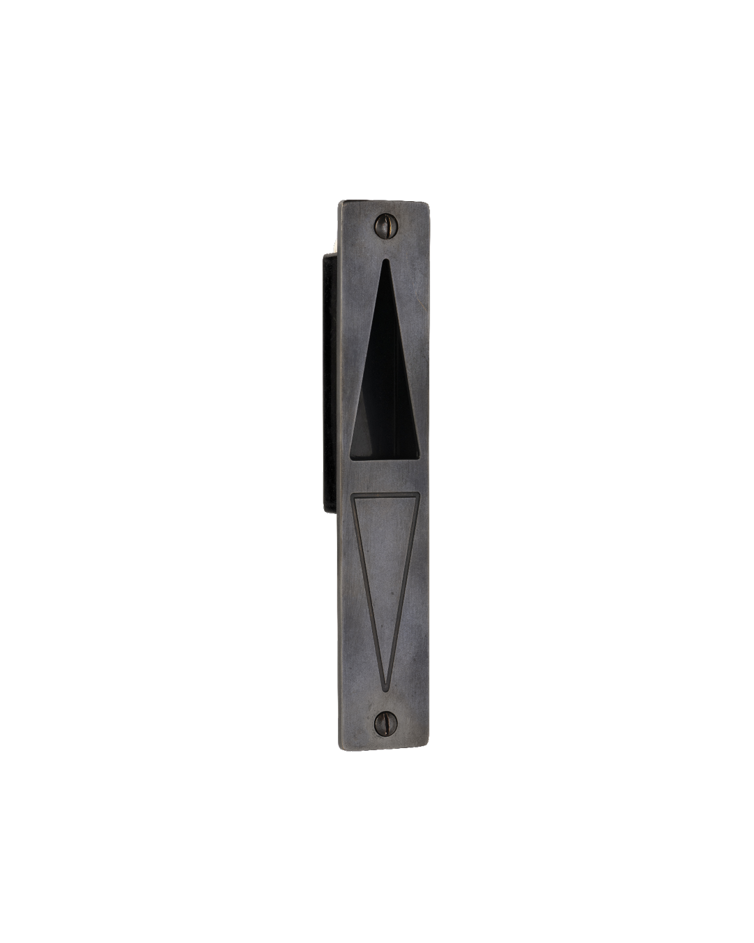 This character is a slender version of the Wide Guy door pull. Cast exclusively in bronze, it features a profile that rises to an angled peak with a triangular cut-out subtly relieving mass at its base. The hand sand-casting process leaves distinctive pitting and pour marks upon its surface. Its patinated finish instantly grants it an aged hue, with its touch points continuing to alchemise over time to rich golden glows. Suitable both indoors and out, it is available in two sizes (small, large).